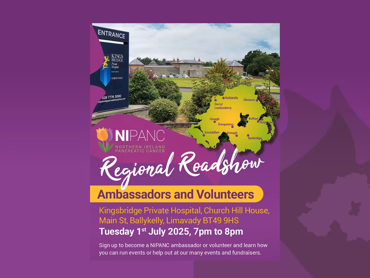 We’re excited to announce the next stop in our NIPANC Regional Roadshows - and this time, we’re heading to Limavady.As our reach and impact grow across Northern Ireland, we’re calling on compassionate, committed individuals to join us as ambassadors and volunteers. This is your chance to become part of a powerful movement to raise awareness, support families, and fund life-saving pancreatic cancer research.Whether you’ve been personally affected by pancreatic cancer or simply want to make a difference in your community, we’d love to see you there.Event Details:Date: Tuesday, 1st July. Time: 7:00 PM – 8:00 PMLocation: Boardroom, Kingsbridge Private Hospital, Church Hill House, Main Street, Ballykelly, Limavady BT49 9HSAt the meeting, you’ll hear more about the work we do at NIPANC, the role of ambassadors and volunteers, and the many ways you can get involved in your local area. Whether you have a little time or a lot, your contribution matters. Interested in joining us? Register your interest Together, we can change the story around pancreatic cancer in Northern Ireland. Register here Share this article LinkedIn Facebook X Email
